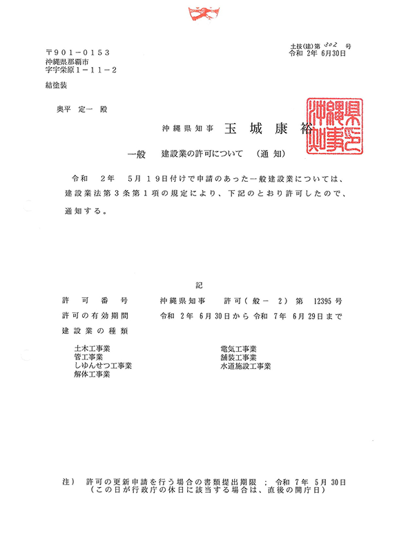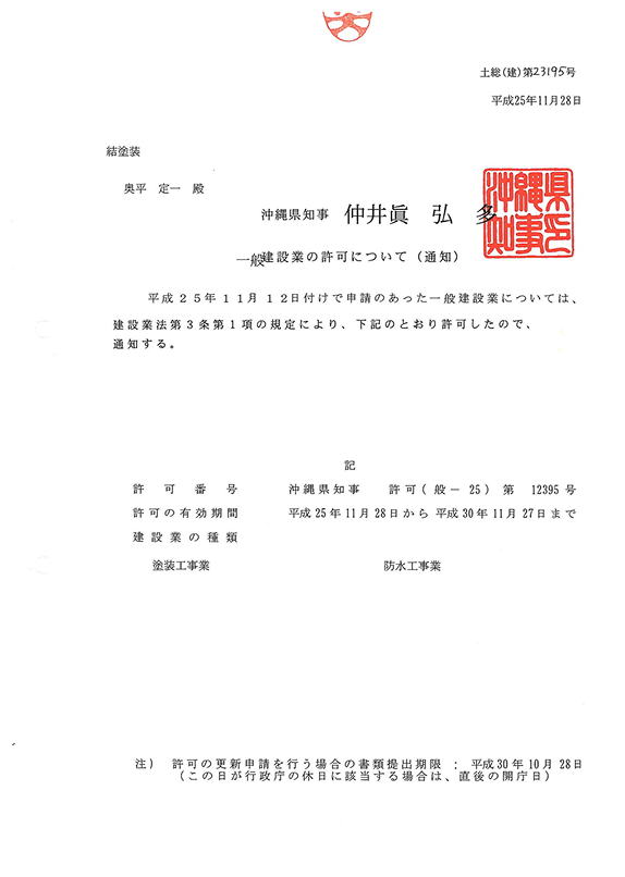 沖縄県知事許可 第12395号 建設業許可一覧 (クリックすると一覧へ移動します) 那覇市営住宅課修繕工事指定店 |